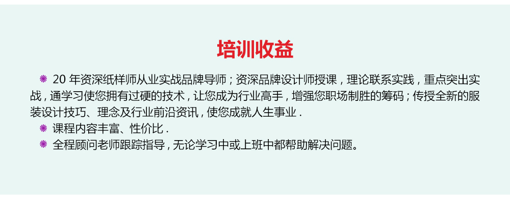 Coreldraw基礎知識及常用工具講解與應用、服裝款式圖繪制:T恤、褲子、連衣裙、西裝外套等;色彩、圖案、面料的設計與導入