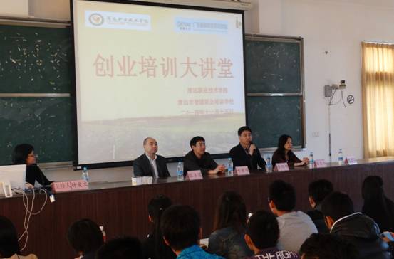 2014年11月15日,清遠(yuǎn)職業(yè)技術(shù)學(xué)院創(chuàng)業(yè)培訓(xùn)大講堂拉開帷幕。清遠(yuǎn)市人力資源和社會(huì)保障局教育培訓(xùn)科科長(zhǎng)葉世頌、廣東智通人才連鎖集團(tuán)公司副總裁李綱領(lǐng)、廣東智通職業(yè)培訓(xùn)學(xué)院院長(zhǎng)張本昌、清遠(yuǎn)職業(yè)技術(shù)學(xué)院繼續(xù)教育學(xué)院院長(zhǎng)陸翠紅、副院長(zhǎng)鐘愛文出席了開講儀式。清遠(yuǎn)職業(yè)技術(shù)學(xué)院及清遠(yuǎn)市廣播電視大學(xué)各專業(yè)共三百二十二名學(xué)生聆聽了講座。開講儀式上,葉世頌科長(zhǎng)致辭,講解了國家開展創(chuàng)業(yè)培訓(xùn)的意義就是鼓勵(lì)創(chuàng)業(yè),以創(chuàng)業(yè)帶動(dòng)就業(yè)。李綱領(lǐng)副總裁介紹了“廣東智通人才”公司,創(chuàng)業(yè)培訓(xùn)大講堂由張本昌院長(zhǎng)主講。