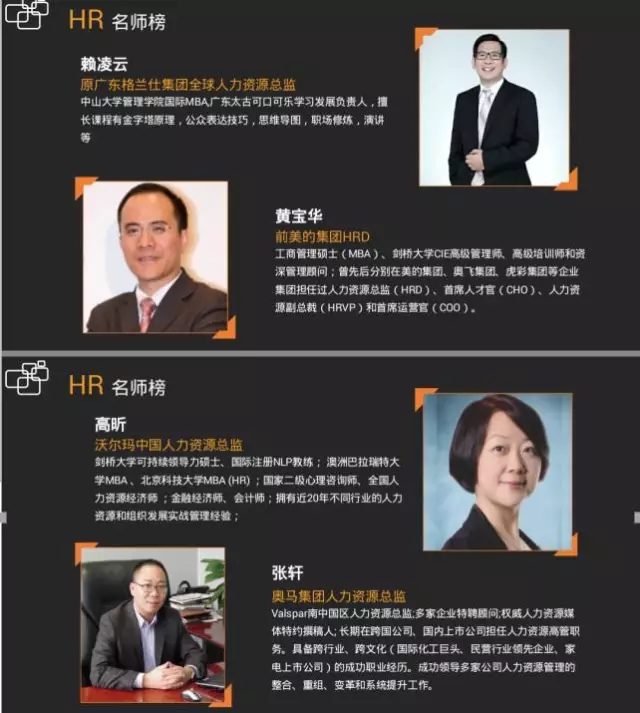 簽完到,轉身走進教室,兩側的名師介紹引入眼簾。細細看去,都是500強人力資源領域實戰老鳥。有騰訊學院講師、有央企商學院院長、有順豐總監······