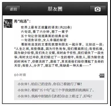 最后,也是我們微信通訊錄里的長輩們,很可能是真認(rèn)同文章觀點,被文中某個句子“擊中”,久久不能自拔,為了感激作者的“深度理解認(rèn)同”,趕緊轉(zhuǎn)發(fā)到朋友圈再加上幾句真心評價。