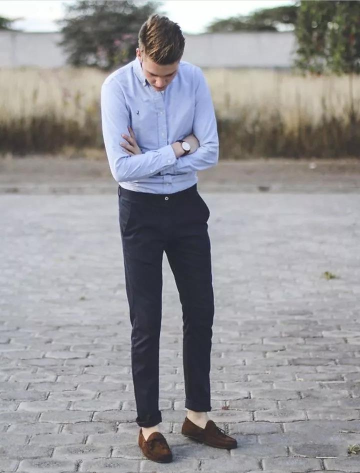 面試時(shí)建議把襯衫下擺包進(jìn)褲子里,這樣顯得比較正式、干凈利落。下身搭配深藍(lán)色卡其褲和樂(lè)福鞋,褲子稍稍卷起,顯得更高挑干練。