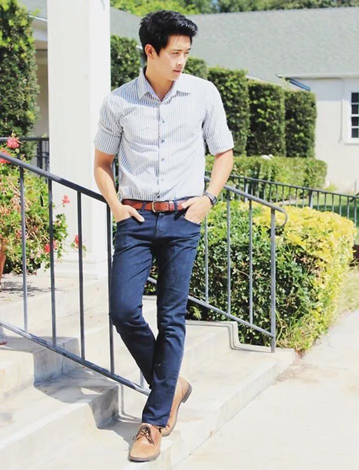 穿搭推薦:細(xì)條紋襯衫×卡其褲