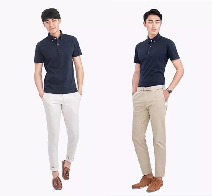 OLO衫松開(kāi)一顆紐扣并自然下垂,搭配白色褲子和樂(lè)福鞋,整個(gè)形象比較休閑(左圖);扣上全部紐扣,下擺包進(jìn)褲子里,搭配卡其色褲子、德比鞋、鋼帶手表的話則更顯正式感。
