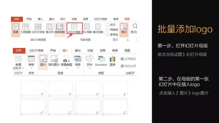 選中功能欄中的“視圖”,點擊幻燈片母版》點選左側幻燈片母版第一張》點擊插入》logo圖片。