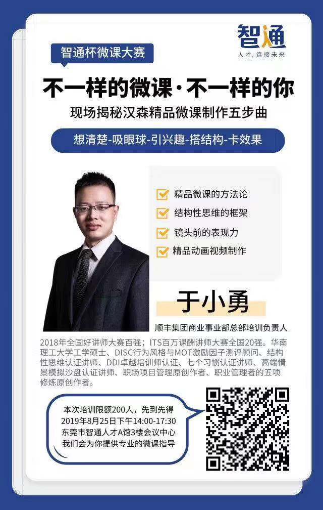 8月25日星期天下午14:00,順豐集團商業事業總部培訓負責人于小勇老師震撼來襲,如果你是想了解一場職業微課如何從無到有,如果你想借助微課變現你的知識,那就快掃描下方圖片二維碼,報名參加我們線下培訓輔導吧!!!