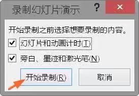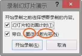 現在,讓我們重新回顧一下“錄制幻燈片演示”后彈出的對話框(如下圖),您就可以發現第二個復選框后顯示的“旁白、墨跡或激光筆”是什么意思了吧?