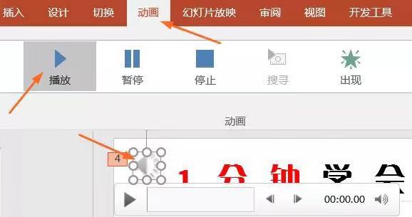 選中音頻或視頻媒體,點擊“動畫”按鈕,然后點擊“播放”,如下圖所示: