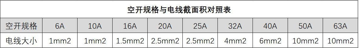 下面看下空開大小和電線大小相對應的表格,大家可以參考一下。
