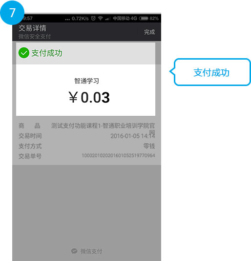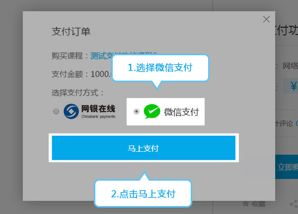 2、在彈出的支付方式選擇框中選擇微信支付。(其他步驟和在課程詳情頁使用微信支付一樣)